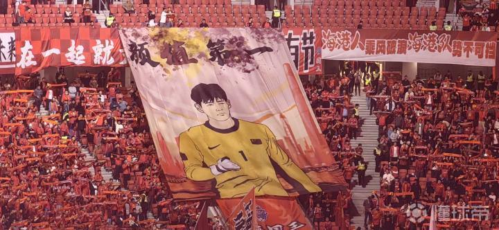 而海港球迷则在看台上打出tifo致敬颜骏凌,tifo中颜骏凌身穿国足1号球衣,上方写着:“颜值第一”,这应该指的是颜骏凌值得第一门将的称号。
