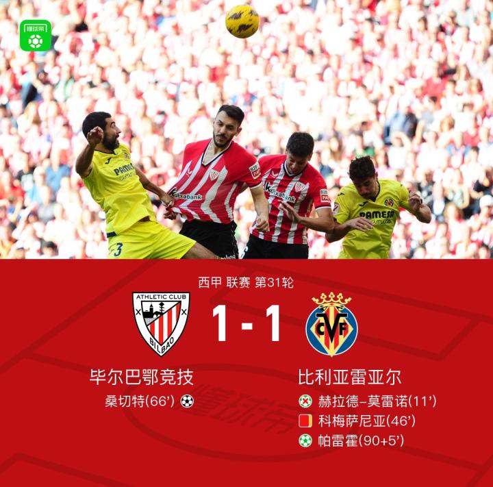 北京时间4月15日,西甲联赛迎来第31轮的激烈对决,毕尔巴鄂竞技在主场迎战比利亚雷亚尔。上半场,贝尔奇切远射被扑,赫拉德-莫雷诺罚丢点球。下半场,科梅萨尼亚累计两黄被罚下,桑切特抽射破门,帕雷霍补时点射绝平,最终,毕尔巴鄂竞技1-1比利亚雷亚尔。