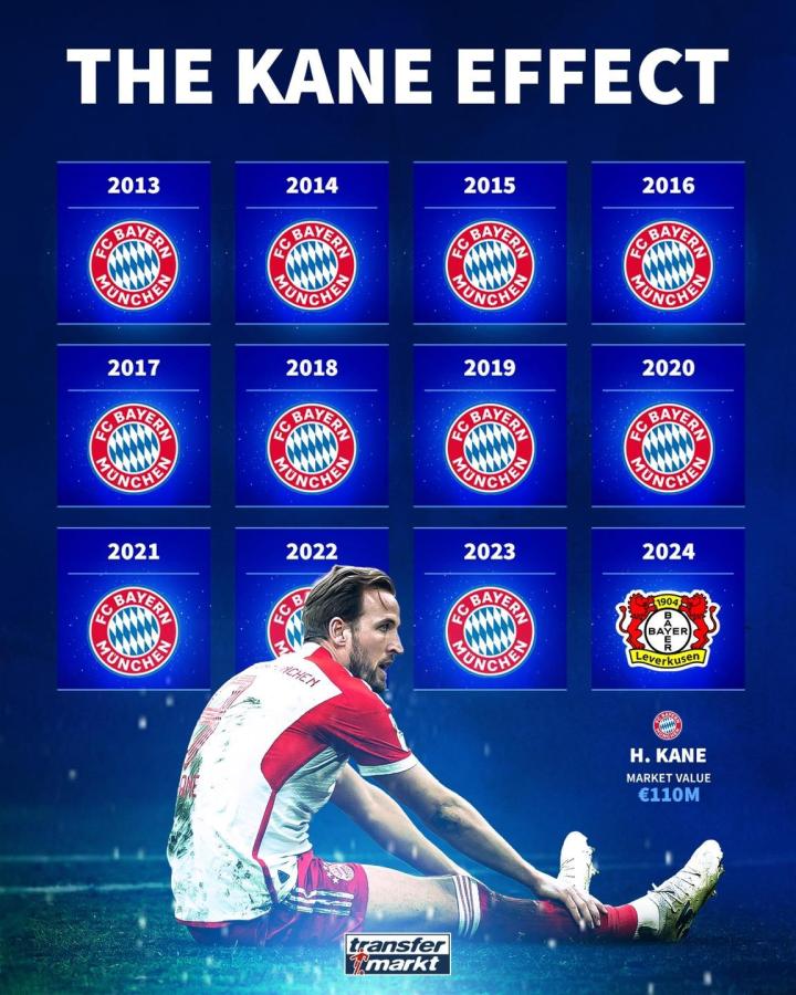 在勒沃库森提前夺冠后,德国转会市场官方晒出图片调侃凯恩,图中列出最近12个赛季的德甲冠军,上方写着“凯恩效应”。