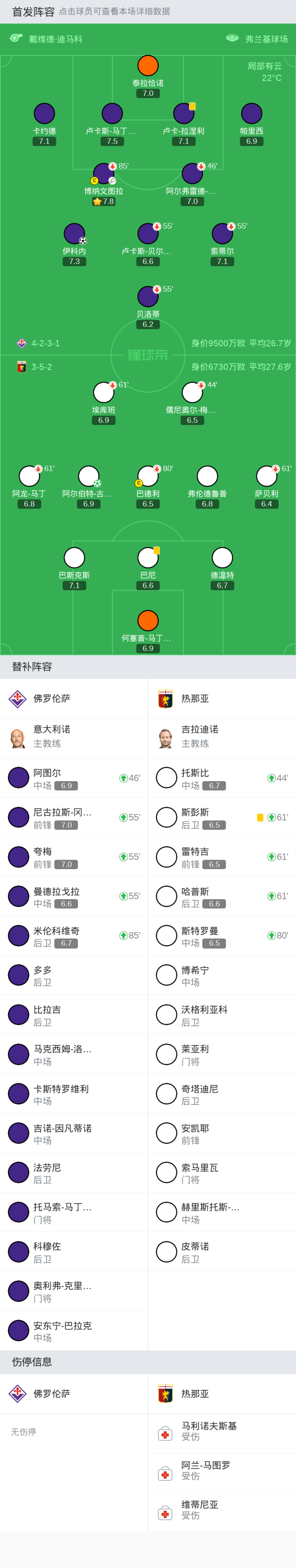佛罗伦萨首发:5-博纳文图拉, 1-泰拉恰诺, 32-阿尔弗雷德-邓肯, 20-贝洛蒂, 11-伊科内, 28-卢卡斯-马丁内斯, 16-卢卡-拉涅利, 7-索蒂尔, 9-卢卡斯-贝尔特兰, 65-帕里西, 33-卡约德