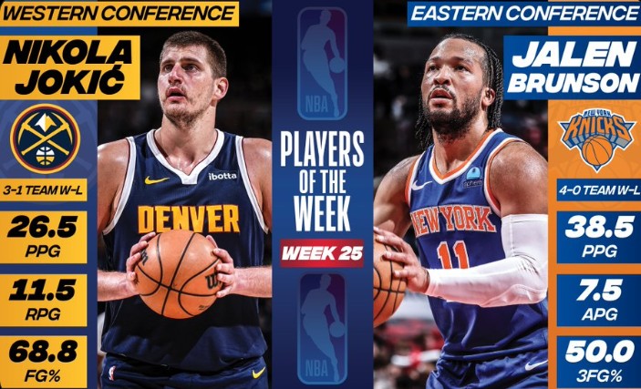 丹佛掘金队中锋尼古拉-约基奇和纽约尼克斯队后卫杰伦-布伦森分别被评为2023-24赛季第25周的NBA西部和东部联盟周最佳球员。