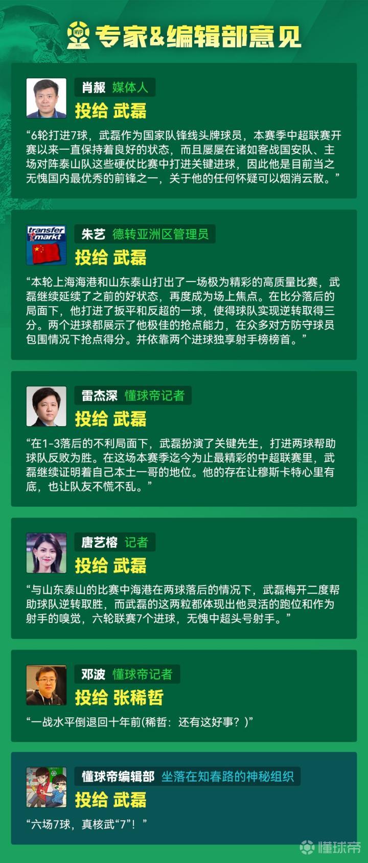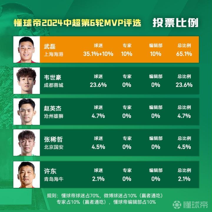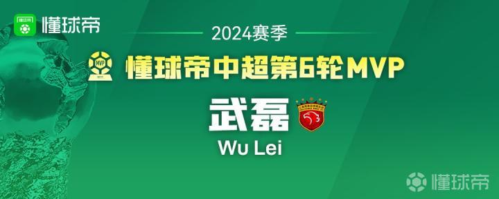 大家好,欢迎来到懂球帝2024赛季中超MVP评选现场。中超第6轮MVP是:上海海港前锋——武磊!
