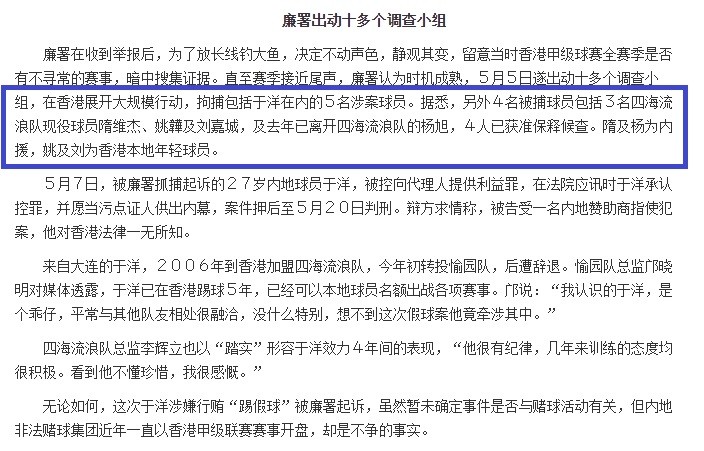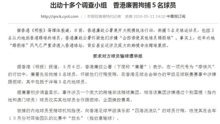 2010年港媒报道“假球风波”:当时在香港踢球的隋维杰被捕