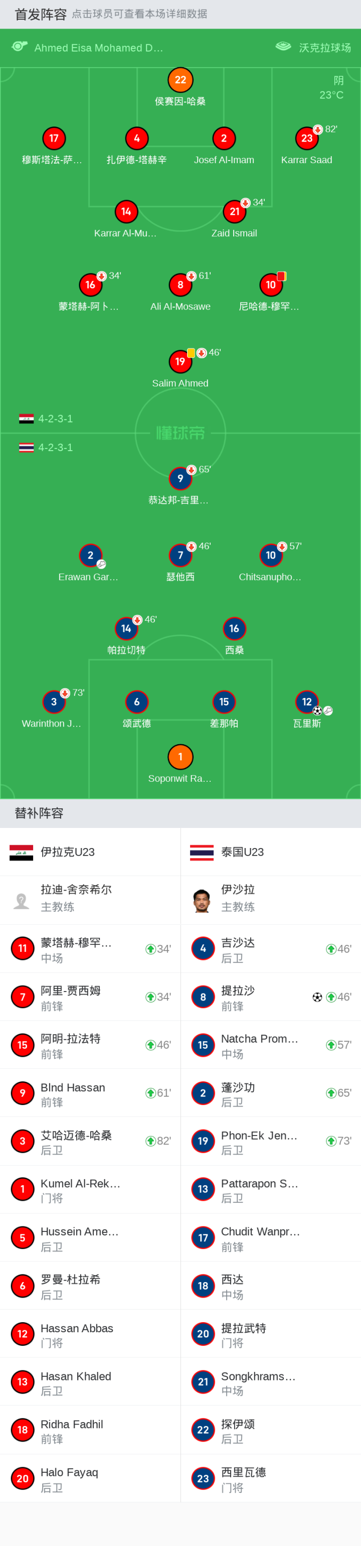 上场替补:34分钟11-蒙塔赫-穆罕默德, 82分钟3-艾哈迈德-哈桑, 46分钟15-阿明-拉法特, 34分钟7-阿里-贾西姆, 61分钟9-Blnd Hassan