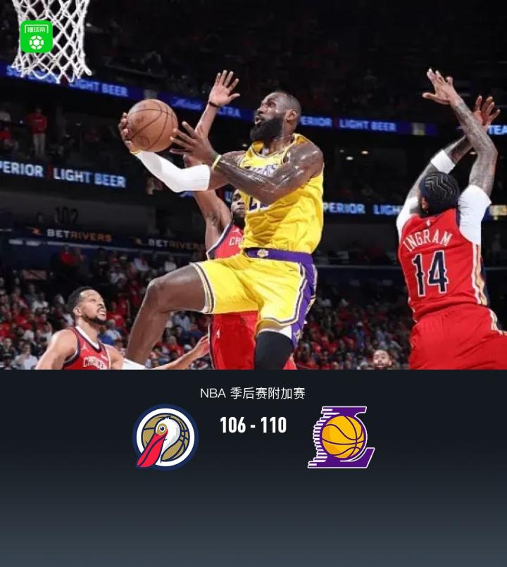 北京时间4月17日,NBA附加赛西部第7鹈鹕主场迎战西部第8湖人,首节鹈鹕锡安内线冲击势不可挡领先8分,次节湖人轰出34-16反超10分,下半场湖人一度领先18分,而随后鹈鹕持续反扑末节后半段追平比分,最后关键时刻鹈鹕锡安伤退,湖人罚球连续命中保持领先,最终湖人110-106鹈鹕。