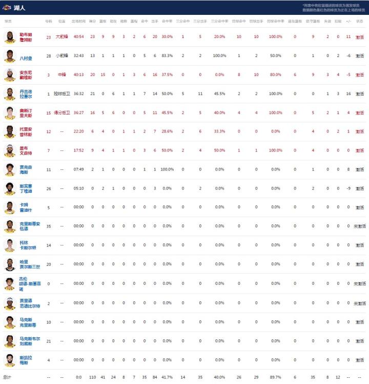 洛杉矶湖人詹姆斯23分9板9助3断2帽,拉塞尔21分6助1断1帽,戴维斯20分15板1断3帽。