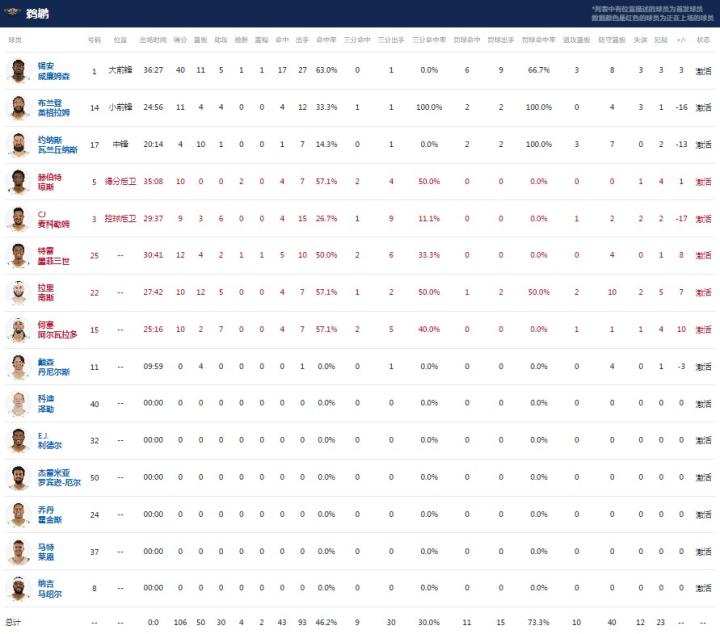 新奥尔良鹈鹕锡安40分11板5助1断1帽,特雷-墨菲12分4板2助1断1帽,英格拉姆11分4板4助;