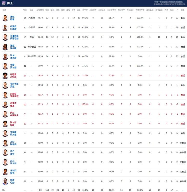 萨克拉门托国王基根-穆雷32分9板2断,福克斯24分4板6助2断,哈里森-巴恩斯17分4板3助;