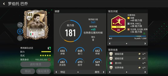 巴乔的基础能力值141,天赋配备了狙击手,提升了加速、射门、远射、抢点、盘带五项数据。花式方面,巴乔同样拥有五星花式星级,基础花式配备了马赛回旋,这让他在前腰位置的盘带摆脱效率更高。