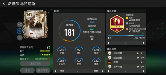 马特乌斯基础能力值达到141,配备了防守型天赋叹息之墙,提升了他的加速、人盯人、铲断、拦截、侵略性五项数据。花式方面,马赛回旋结合四星花式星级也让作为中场球员的马特乌斯盘带能力更为出色。