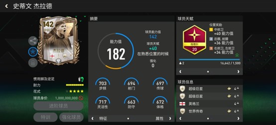基础能力值142的杰拉德配备中场热门的指南针天赋,提升了自身的加速、射门力量、盘带、控球、敏捷五项数据。花式方面,杰拉德基础花式为高级油炸丸子,搭配四星花式星级,具备稳定的中场持球能力。