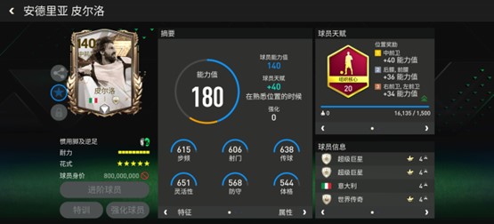 皮尔洛的基础能力值只有140,天赋配备了组织核心,对他的短传、长传、视野、盘带、反应五项数据有所提升。花式方面,皮尔洛的基础花式配备了马赛回旋,花式星级为五星,同样有不错的中场推进能力。