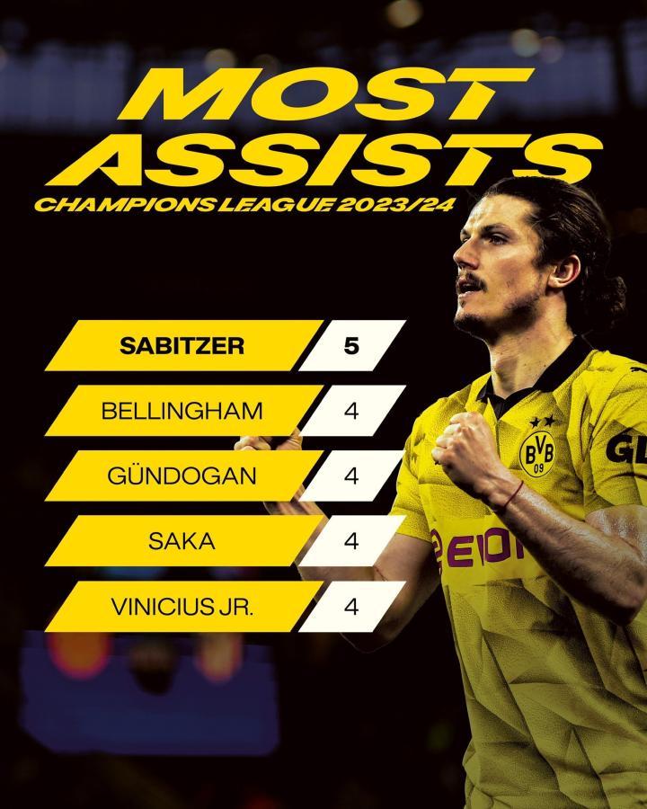 多特蒙德官方社媒赛后晒出本赛季欧冠助攻榜数据,萨比策以5次助攻领跑榜单,大黄蜂旧将贝林厄姆、京多安送出4次助攻,与萨卡、维尼修斯并列次席。