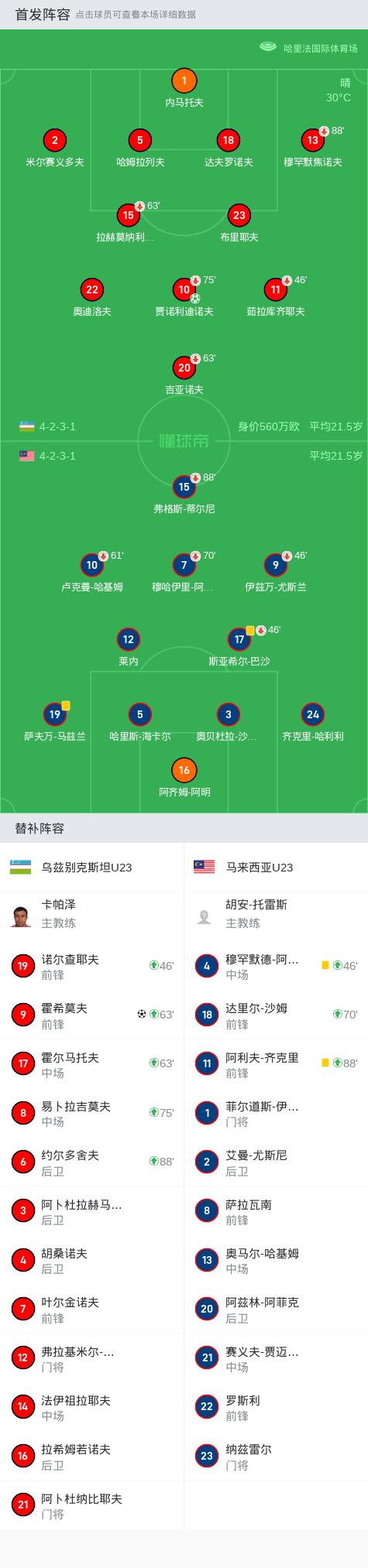乌兹别克斯坦U23首发:1-内马托夫, 10-贾诺利迪诺夫, 2-米尔赛义多夫, 11-茹拉库齐耶夫, 18-达夫罗诺夫, 23-布里耶夫, 20-吉亚诺夫, 22-奥迪洛夫, 5-哈姆拉列夫, 15-拉赫莫纳利耶夫, 13-穆罕默焦诺夫