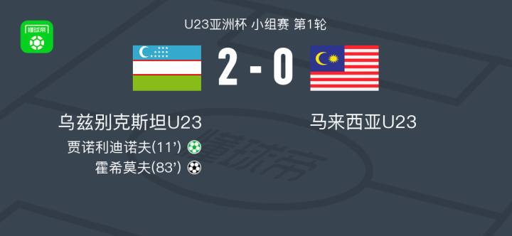 北京时间4月17日U23亚洲杯 小组赛 第1轮,乌兹别克斯坦U23主场对阵马来西亚U23。乌兹别克斯坦U23贾诺利迪诺夫破门,霍希莫夫破门。最终比分乌兹别克斯坦U23 2-0 马来西亚U23。