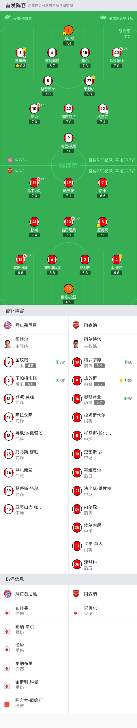 替补:13-舒波-莫廷, 26-乌尔赖希, 25-托马斯-穆勒, 18-丹尼尔-佩雷茨, 39-马蒂斯-特尔, 17-萨拉戈萨, 45-亚历山大-帕夫洛维奇