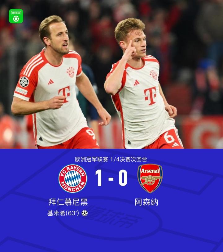 北京时间4月18日欧洲冠军联赛 1/4决赛次回合,拜仁慕尼黑主场对阵阿森纳。凯恩开场连续打门造险,穆西亚拉远射被扑,马丁内利推射被诺伊尔没收,下半场格雷茨卡和格雷罗先后中柱,基米希头球冲顶破门。最终比分拜仁 1-0 阿森纳。两回合总比分拜仁3-2阿森纳晋级四强。