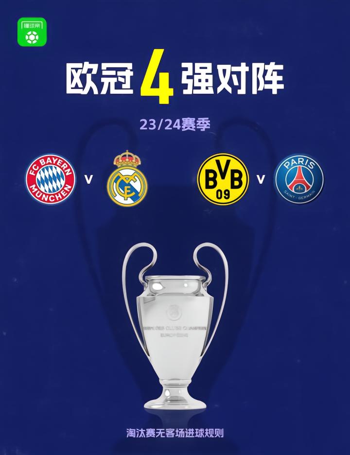 欧冠四强对阵出炉:拜仁迎战皇马、多特对阵巴黎