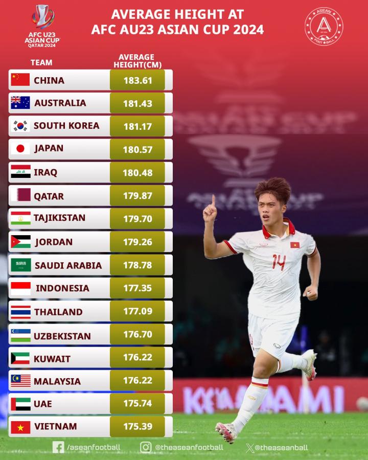 U23亚洲杯平均身高:中国183.61cm第一,韩国第三,日本第四