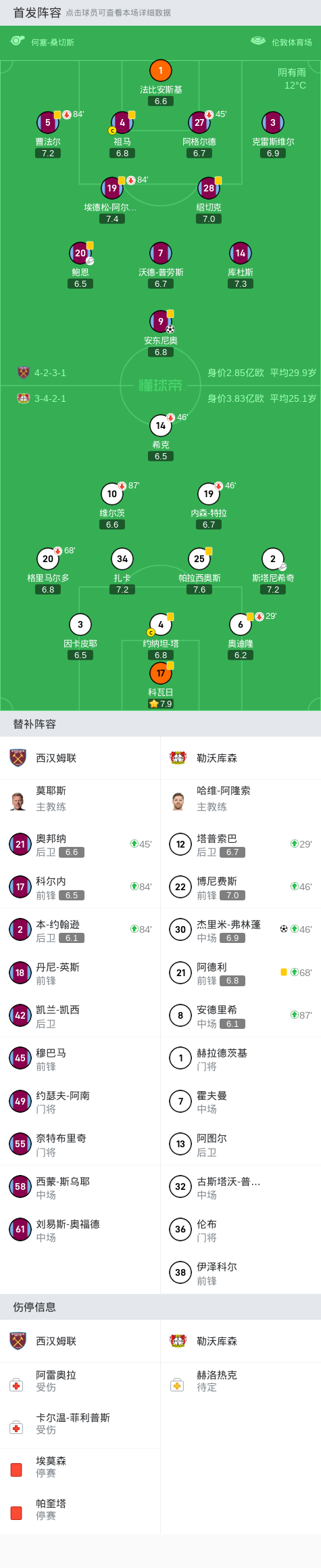 西汉姆联首发:1-法比安斯基, 3-克雷斯维尔, 9-安东尼奥, 5-曹法尔, 4-祖马, 7-沃德-普劳斯, 28-绍切克, 20-鲍恩, 27-阿格尔德, 19-埃德松-阿尔瓦雷斯, 14-库杜斯