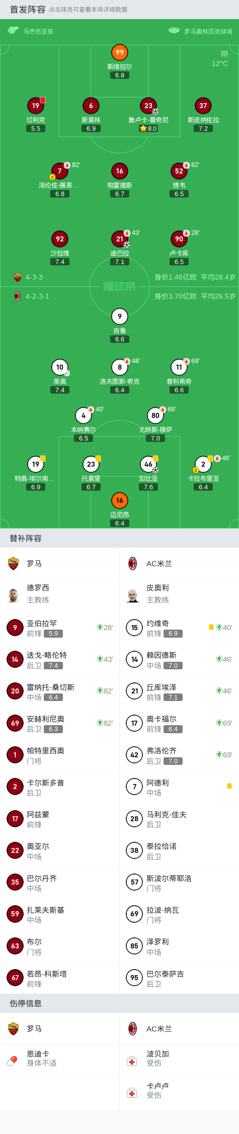 罗马首发:92-沙拉维, 6-斯莫林, 90-卢卡库, 16-帕雷德斯, 37-斯皮纳佐拉, 21-迪巴拉, 19-切利克, 7-洛伦佐-佩莱格里尼, 99-斯维拉尔, 23-詹卢卡-曼奇尼, 52-博韦