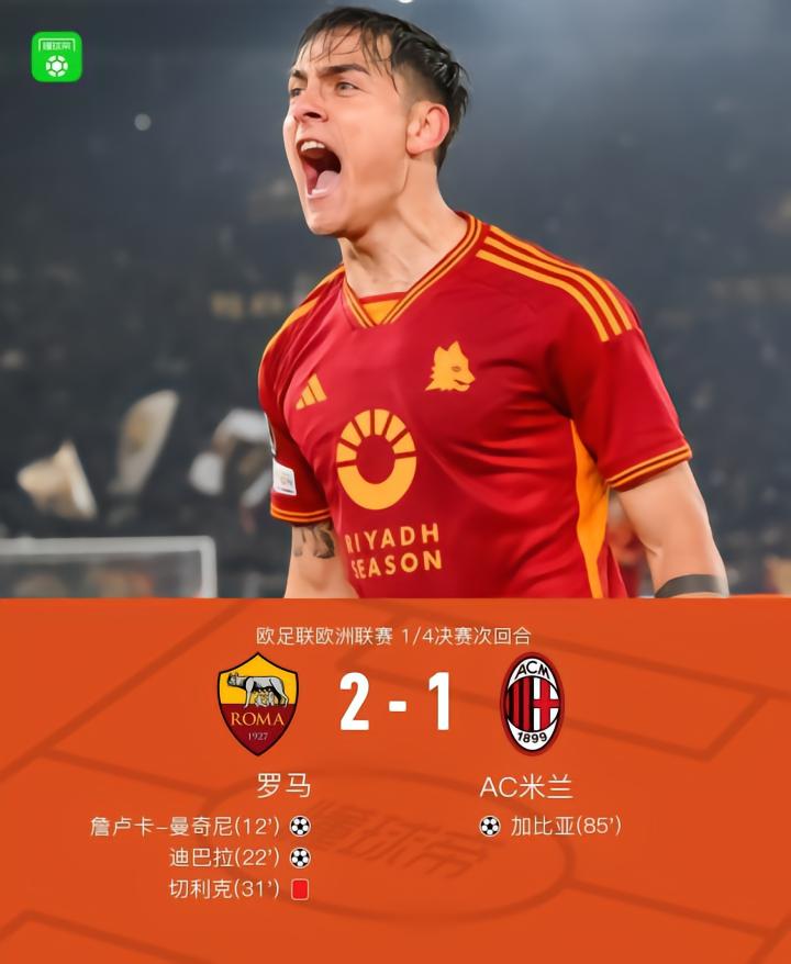 北京时间4月19日欧足联欧洲联赛 1/4决赛次回合,罗马主场对阵AC米兰。上半场,佩莱格里尼远射中柱后曼奇尼机敏补射破门,奇克凌空扫射击中横梁,迪巴拉兜射入网扩大比分,卢卡库有些受伤被换下场,切利克铲球蹬到莱奥脚后跟被直红罚下;下半场,斯皮纳佐拉推射被挡,赖因德斯远射被托出横梁,莱奥助攻加比亚头球破门扳回一个,丘库埃泽内切兜射被扑。最终比分罗马2-1AC米兰。两回合总比分罗马3-1AC米兰。