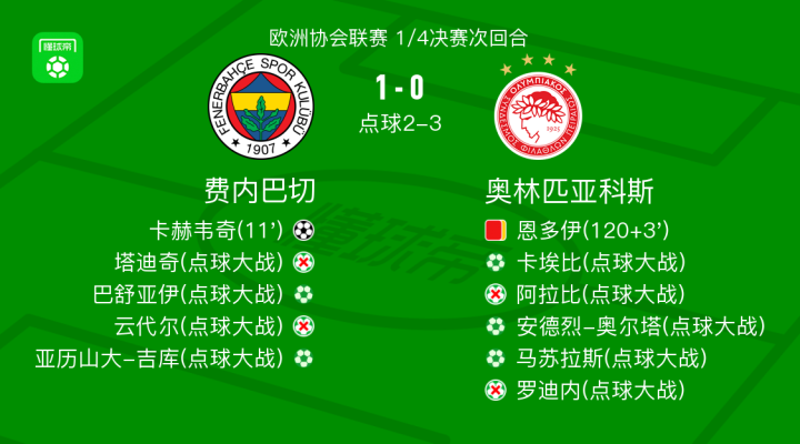 北京时间4月19日欧洲协会联赛 1/4决赛次回合,费内巴切主场对阵奥林匹亚科斯。费内巴切卡赫韦奇破门。最终比分费内巴切 3-3 奥林匹亚科斯。两回合总比分费内巴切5-6奥林匹亚科斯。