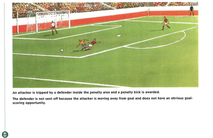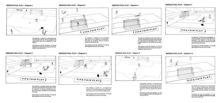 1995/96赛季,为了解决一直以来对“阻止明显进球机会”判定标准的争议,IFAB在《足球竞赛规则》的附录里使用了多张图示,解释了各种情况下是否会被认定为“明显”的进球机会。虽然在这里只是图示,但几条之后被总结归纳并正式纳入规则中的标准已经有了雏形,包括犯规地点、进攻发展方向等等。