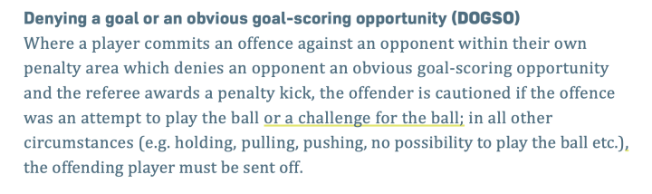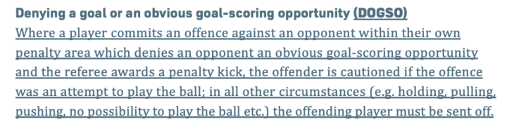 所以,IFAB做出了非常大的调整:他们调整了文本的顺序。本来放在靠后位置上的关于禁区内出现DOGSO犯规的分类处理办法的内容,放到了本段的第一句,然后在这一小节的标题上加了一个括号,括号里是五个字母——没错,就是“DOGSO”。