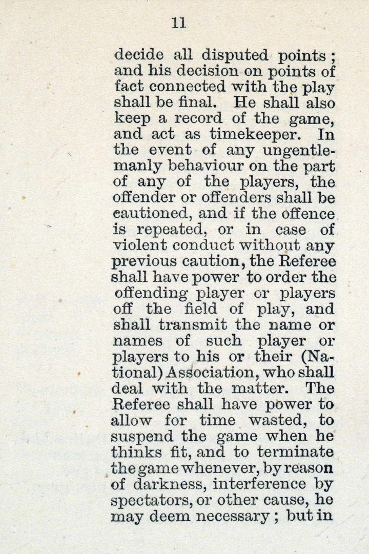 1863年,第一部《足球竞赛规则》诞生。在这一版本的规则里,并没有对违反规则的处罚做出明确的规定。在IFAB官网上的历史文件中,最早能找到的竞赛规则版本是1903年的。这一版本的规则中,对罚令出场的规则依旧比较古典:警告(相当于今黄牌)适用于“不绅士的行为”,而此类行为在被警告后仍然出现,或者在没有警告的情况下出现“暴力行为”,都可以被主裁判罚令出场(相当于今红牌)——当然,这时候红黄牌规则还没有诞生。规则中还规定了,在被罚令出场后,裁判要将相关运动员的名字纪录下来,并报给运动员所属的协会进行进一步处理。