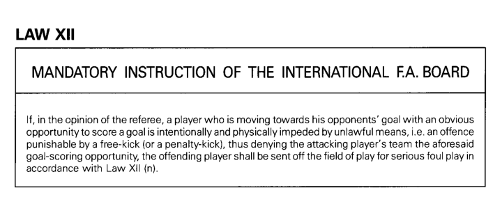 70-80年代,在经历了米歇尔斯和萨基两代战术大师的洗礼后,进攻和防守两端对空间的关注都达到了前所未有的高度,所以足球规则的修改中增加对于整体攻防场景的关注实际上也是顺理成章。于是在1990/91赛季,《足球竞赛规则》中第一次提到关于防守队员使用犯规动作破坏“明显进球机会(obvious opportunity to score a goal)”的情形。