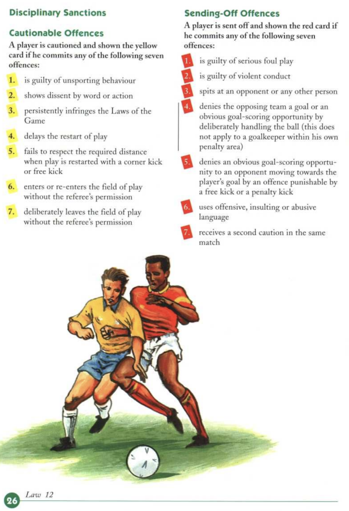 还是在第12章“犯规和不正当行为”中,“denies an obvious goal-scoring opportunity”正式列入了可以被出示红牌的犯规里。不过,原文的表述和1990年的版本一脉相承,依旧是“使用可以被判罚直接任意球或点球的犯规”阻止明显进球机会。