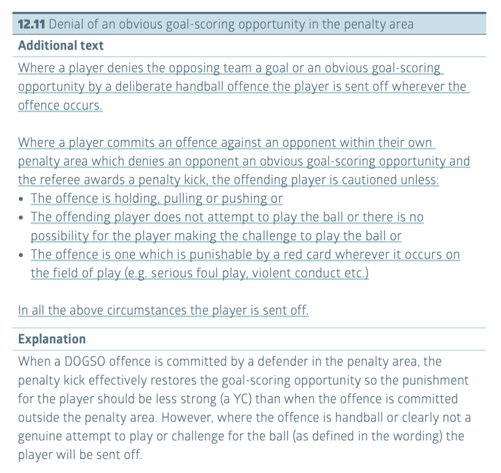 意外地是,我在查阅这一版本的正文时发现,其实在这一版本后附的规则修改详细阐释中,就已经有了这个最近才广泛为人所知的表述:对于禁区内发生的DOGSO事件,点球的判罚就已经足够弥补进攻球队的损失,所以除非是手球或者明显不是想要踢球或抢球的动作,出示黄牌警告就已经足够。