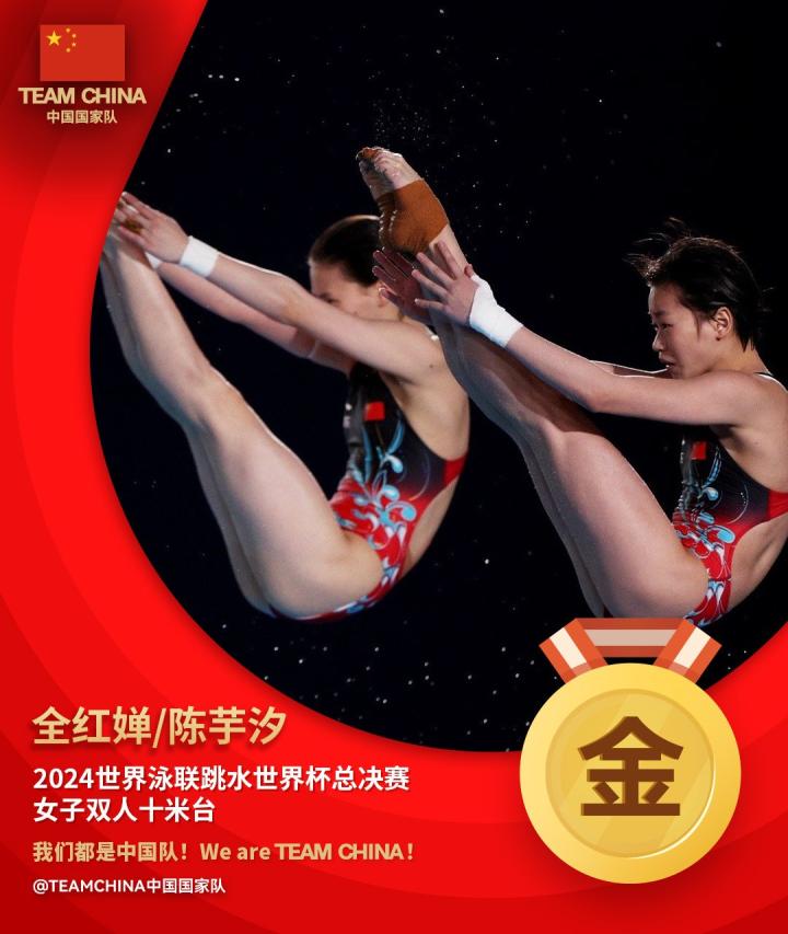 4月19日,2024跳水世界杯西安总决赛女双10米台决赛战罢,全红婵和陈芋汐为中国队夺得本届赛事首金。