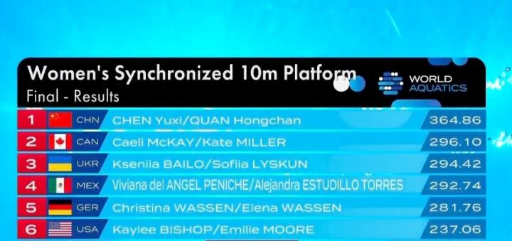 比赛中全红婵和陈芋汐以绝对优势碾压其他选手拿到冠军,总成绩364.86分,领先亚军68.76分。加拿大组合和乌克兰组合分获亚军和季军。