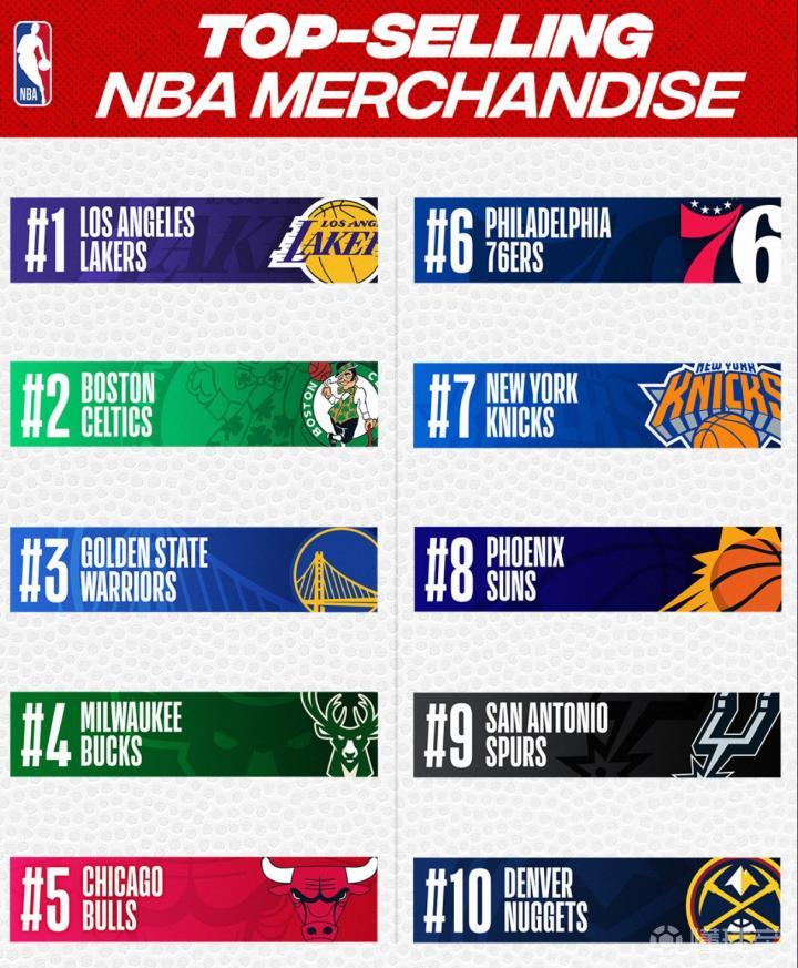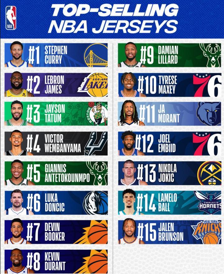 北京时间4月19日,NBA官方发布了本赛季下半赛季球衣销量排行榜,库里、詹姆斯、塔图姆位居前三。同时,NBA发布了本赛季下半赛季球队产品销售排行榜,湖勇进入前三,公牛第五。