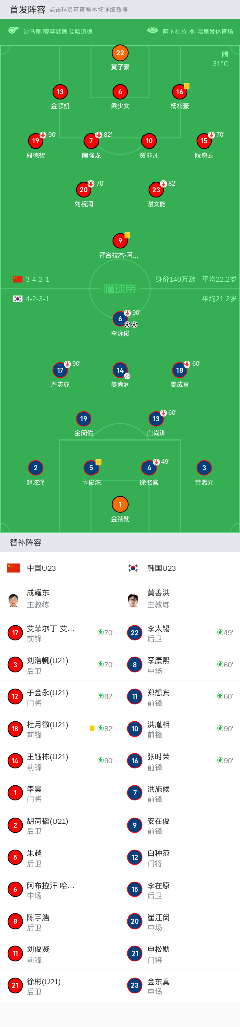 韩国U23首发:1-金祯勋, 13-白尚训, 17-严志成, 2-赵玹泽, 5-卞俊洙, 18-姜成真, 6-李英俊, 19-金闵佑, 3-黄渽元, 14-姜尚润, 4-徐名官