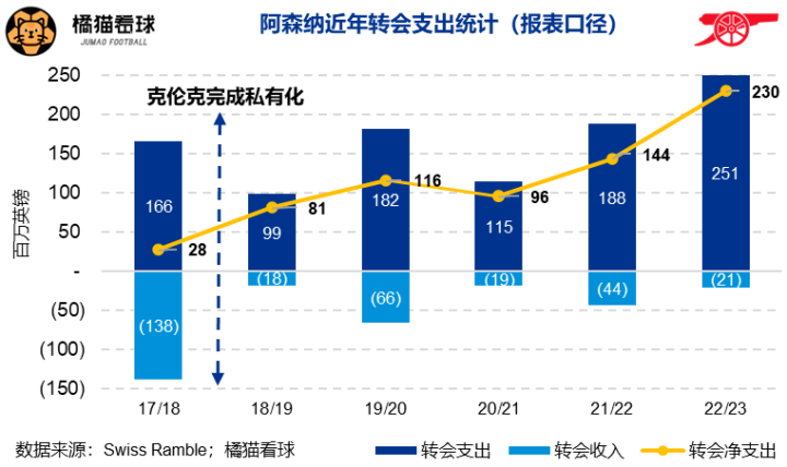 自克伦克2018年完成对阿森纳的完全私有化以来,兵工厂的投资风格骤然变化:2018年前的五个赛季(13/14-17/18)转会净支出合计2.89亿英镑,之后的五个赛季(18/19-22/23)转会净支出高达6.67亿,对比明显。