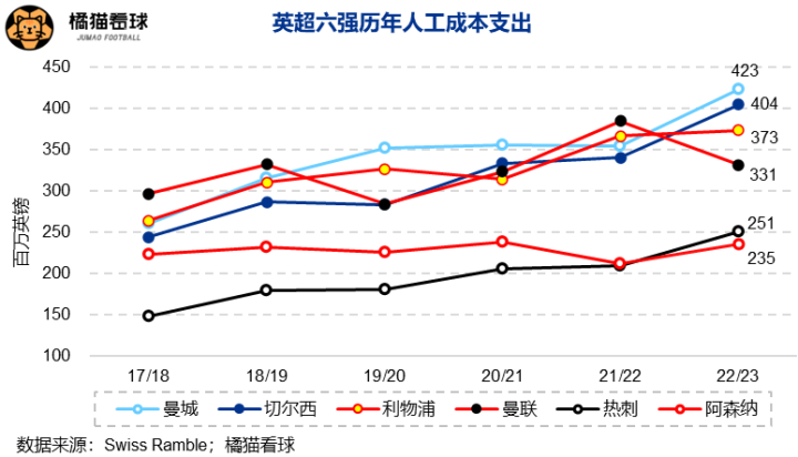 17/18赛季以来,兵工厂的工资单徘徊在2.12-2.38亿英镑之间,并未受到足坛通货膨胀的影响。当然,这与球队长期缺席欧冠有关,若以近些年在欧冠区内外“反复横跳”的曼联为参照,加上4,000-5,000万的“欧冠溢价”后,阿森纳的工资水平依然远低于热刺之外的其他对手,可见其工资控制之得当。