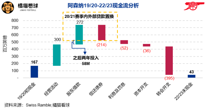 自疫情爆发的19/20赛季至22/23赛季,兵工厂在转会方面花费了3.95亿英镑的现金,再加上5,200万的利息费用和3,600万基础设施资本开支,现金流出合计4.83亿。首先消耗的是自家的现金储备,“七存息”时代俱乐部账面的现金长年高于两亿,19/20赛季初仍有1.67亿之巨,到22/23赛季末只剩下4,300万。