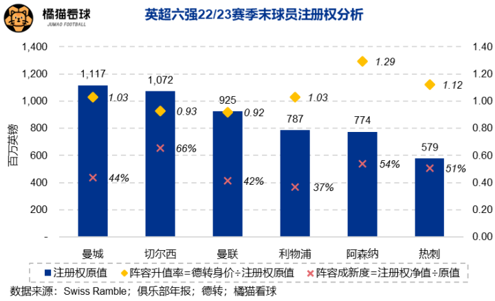 经历多年的巨额投资后,兵工厂上赛季末账面球员注册权原值达到7.74亿英镑,在六强中仅排名倒数第二,足见之前阵容之薄弱;54%的成新度仅次于切尔西的66%,佐证了其注册权价值的确由近几年新加盟的球员撑起。