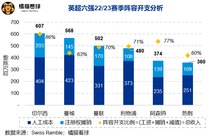 加上注册权摊销,阿森纳的竞技支出在六强中也只排倒数第二。根据欧足联最新的财政可持续性规则(FSR),球队的“工资帽”比例为77%,完全符合22/23赛季压降到90%以下的要求,有了欧冠收入后,根据要求两年内逐步降至70%以下应不成问题。
