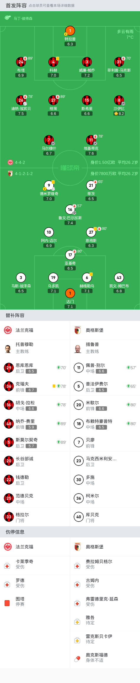 法兰克福3-1逆转奥格斯堡,沙伊比、埃基蒂克、马尔穆什破门