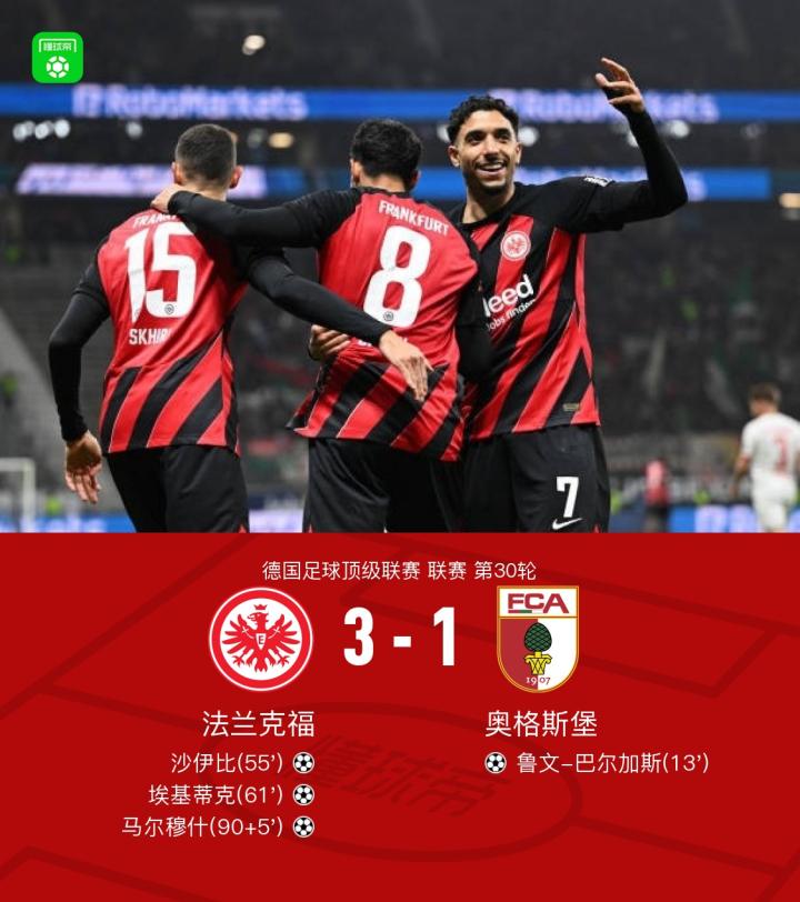 在德国足球顶级联赛第30轮的比赛中,法兰克福队在主场迎战奥格斯堡队。上半场,德米罗维奇斜传,鲁文-巴尔加斯插上射门得分率先改写比分。下半场,迪纳-埃宾贝传中,沙伊比门前推射破门将比分扳平。埃基蒂克凭借个人能力破门将比分反超。补时最后一分钟,马尔穆什单刀推空门锁定胜局。最终法兰克福主场3-1逆转奥格斯堡。