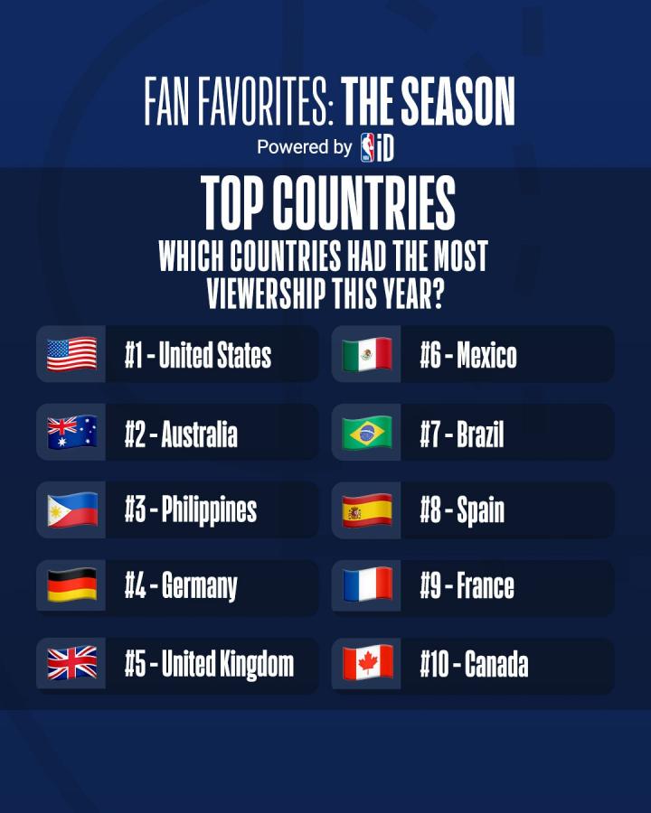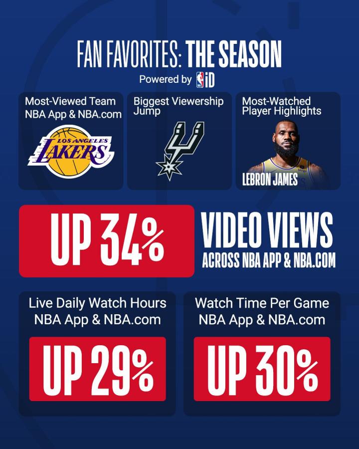 北京时间4月20日,NBA官方总结了本赛季NBA官方App和官网的视频及直播观看量统计。