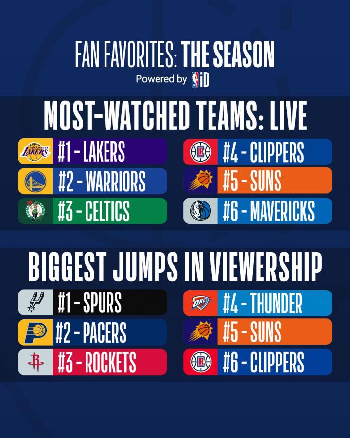 本赛季收视率最高的球员球队:詹姆斯和湖人包揽双料冠军