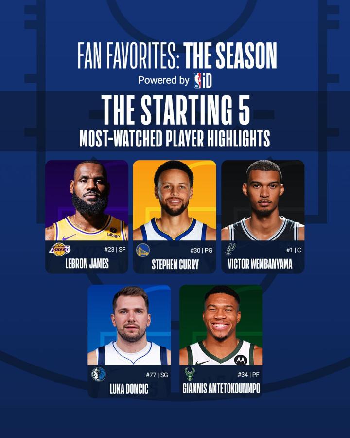 勒布朗-詹姆斯、斯蒂芬-库里、维克托-文班亚马、卢卡-东契奇、扬尼斯-阿德托昆博。