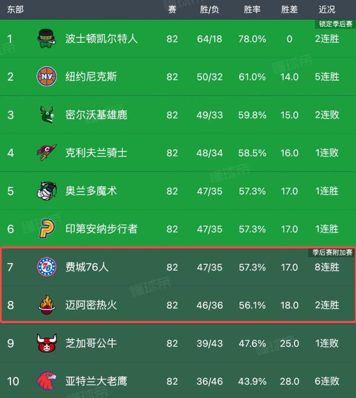 晋级队:湖人(西部第8)、鹈鹕(西部第7)、76人(东部第7)、热火(东部第8)。