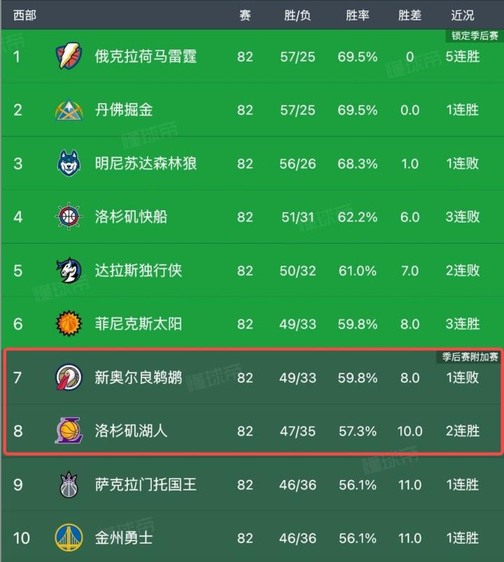 唯一不同的一点是附加赛第一轮湖人战胜了鹈鹕,鹈鹕与湖人排名换了个位置,湖人最终以第7战掘金,鹈鹕以第8打雷霆。
