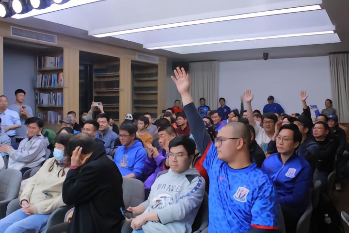 在第二部分,现场观众纷纷举手向吴金贵提问。吴金贵耐心回应了大家的提问,包括金贵青训中心的未来建设、如何看待AI在足球领域的前景、如何平衡青训中踢球与上学之间的关系……